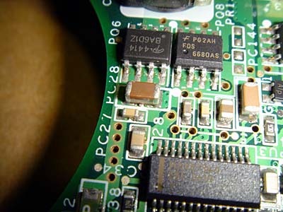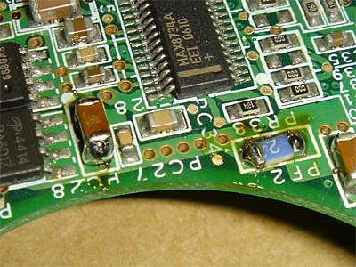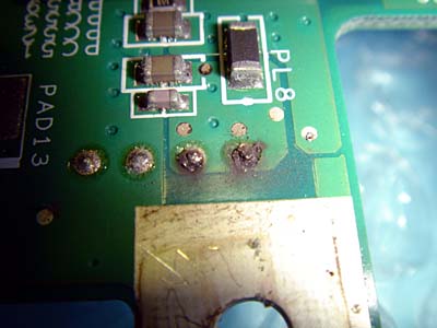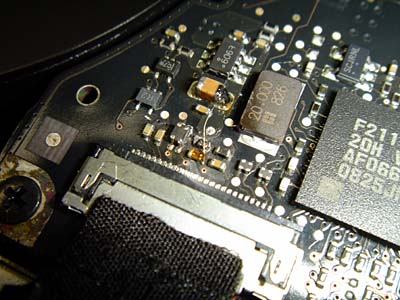 MacBook Pro 15" Late 2008 AirMacが機能しなくなった。 ディスプレイのヒンジ中央に設置されたAirMacカードのコネクタ部でショートが起きて、ロジックボード上のセラミックフィルタが焼けていました。 ユニボディになった最初のモデル、その後のマイナーチェンジでAirMacカードは本体側に置かれるようになったとさ! |