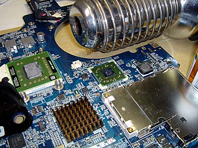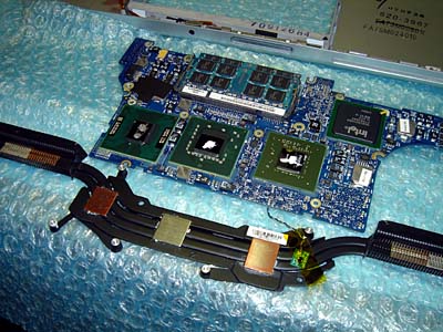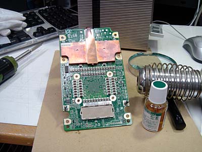 「Power Mac G5」は、ロジックボード上のメモリコントローラチップを疑ったが、そこよりCPUユニット側のコネクタに問題があるようだ。 「iMac G4 17"」は、CPUを炙ったら、蘇った。 一時的に改善はするが、また同じようになることが多い |