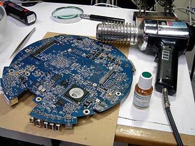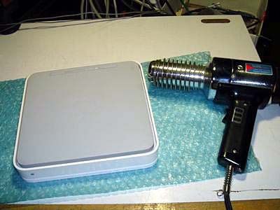 Apple Time Capsule 電源が入らない。 ただでさえ暑い作業場で、1kWのヒートガンであぶりながら慎重にゴムシートを剥離 無事動作しましたが、やはりかなり熱くなります。 アップル製品は、デザインを余りにも重視し過ぎ、オイオイ、と思われる物が多々 長年の経験と勘で培われた技術で被害を最小限にいたします。 |