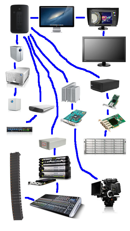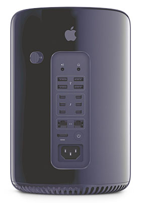 意表をつくデザイン、大きさも直径168mm、高さ251mmと大変コンパクトに、でも性能は現行機のほぼ2倍、内部の拡張性をほぼ一切捨て、6つもの「Thunderbolt 2」で、何でもつないでちょうだいとばかりに・・・ かといって、これでは・・・